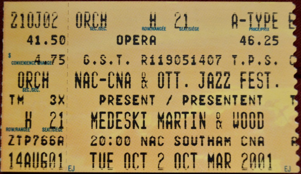 On October 2nd, 2001 Medeski Martin & Wood were playing at the National Arts Centre and I had a ticket (of course). It’s curious that despite the fact that it seems pretty unimportant, I’m sitting here struggling to remember how I got to the show. At the time I was living in a nifty two-storey loft apartment in Ottawa’s Chinatown and it would have been a pretty long walk to and from the NAC. And I doubt I drove; I rarely drive anywhere in the city.