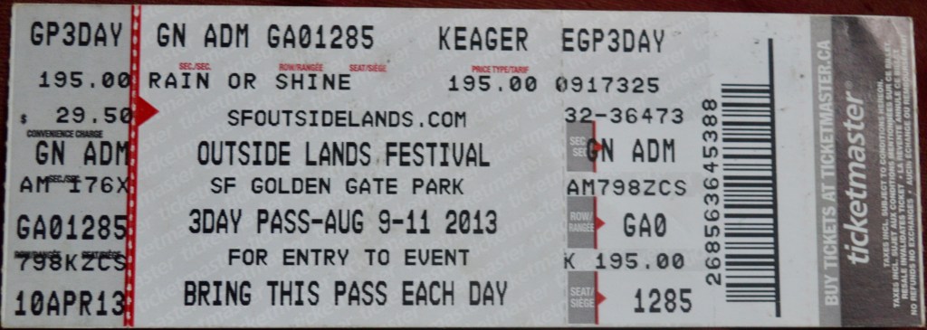On August 10th, 2013 m’lady and I awoke in our friends’ swanky San Francisco apartment and spent the morning sipping coffees and discussing the upcoming contents of this, our second day attending Outside Lands music festival. Outside Lands veterans that they were, our hosts were aghast at my suggestion that there didn’t seem to be much to see until later in the evening. So we dashed out to a hip grilled cheese sandwich restaurant for lunch and by 2:30 we were on the road to the festival grounds, careening up and down the most unlikely steep, winding streets. Our brand-new brakes and tires were earning their keep.
