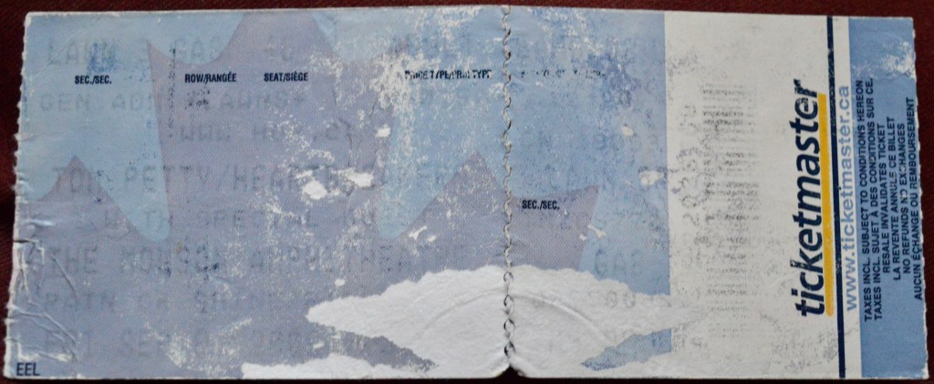 But the answer dawned on me when I looked at the old ticket stub. I had completely forgotten that I spent my first Tom Petty show standing in the pouring rain* on the lawn of the Molson Amphitheatre. And looking at the date it occurs to me I would have just returned from a very exhausting five-week long bicycle trip across Scandinavia a couple of days before, so I was probably very tired and jet-lagged in addition to being quite soggy and uncomfortable.