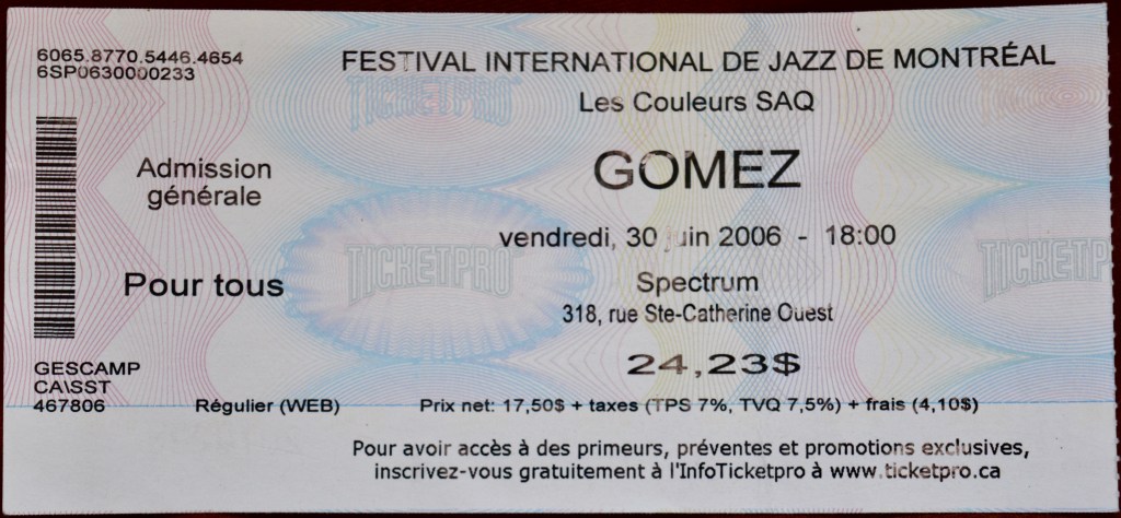 So I’m confident that m’lady and I departed Ottawa with as much afternoon ahead of us as possible, and I’m equally confident that once we arrived we took in any number of free shows preceding Gomez’s 6pm start time, but I remember none of these events in particular. Rather, any residuals I might have of finding a free place to park on one of the nearby side-streets lined with classic Montreal brownstones or sitting on the edge of a concrete planter listening to classic Montreal cerebral atmosphere-jazz while the smell of warm bagels, steamed hot dogs, and stale beer wafted through the air are just so many shards of memory in the grand fresco that my mind holds of Montreal’s jazz festival.