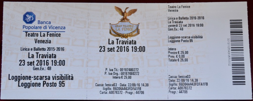 We stopped for dinner, our only meal of the day. I didn’t really feel like Italian food but whatcha gonna do? I had lasagna (again) and m’lady had soup (again, again). We shunned wine at dinner in case that was part of m’lady’s malady (she had started the trip on the ill side) and got out of there with plenty of time to get to the Teatro Fenice (Phoenix Theatre).