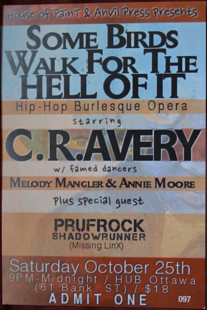 Nor is it enough to have full-colour handbills printed out featuring a clever tagline like “Some Birds Walk For The Hell Of It (which is also the title of your new book of poetry), as Cravery did for the show I saw him perform on October 25th, 2014. Certainly all of these things are necessary parts of the required combination, but to win the lottery one needs every single one of their numbers to come up. Coming close will do little more than offer you a free ticket – another kick at the can that is just as likely to come up short.