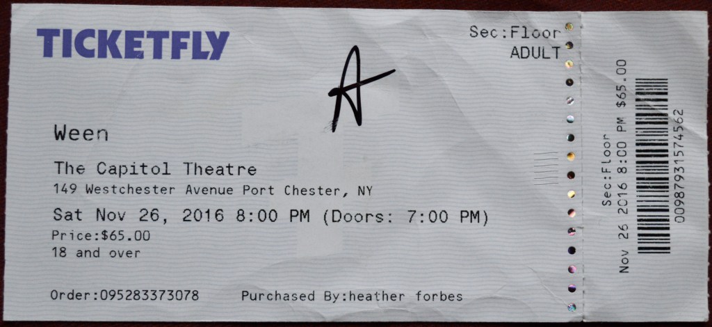 Ho boy. It’s curious when I think how long I have been putting off writing this one. I guess that proves that these ticket stories are more about psychology than entertainment, more catharsis than codification. Well, in this case it’s the deep introspections of a shallow extrovert as I dare relate to you the snippets that I can recall of a Ween concert in Port Chester, New York on November 26th, 2016.