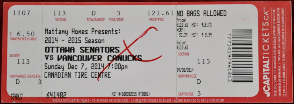 If I’m not mistaken, tickets to the Ottawa/Vancouver game on December 7th, 2014 might have been an early Christmas present from me to m’lady, though I could easily be wrong about that. It makes sense though; before moving to Ottawa from her home in the Vancouver area the Canucks were her favourite team (of course), and on top of that these were no ordinary tickets.