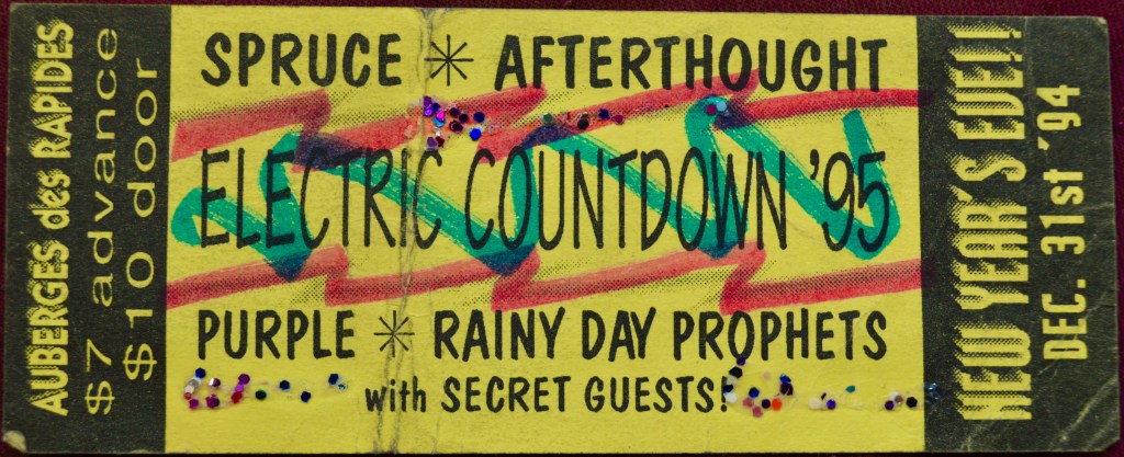 With regards to this ticket from December 31st, 1994…well, I don’t remember a whole lot specifically from this night but then that’s pretty much how the events were designed. I remember watching Purple open the show but I’m pretty sure the band was just two people back then? I always liked Purple…is it possible this was the first time I saw them? They registered a relatively tiny blip on the Ottawa music scene but like I say, I always thought they were pretty good. The little piece of paper that lives beside the ticket stub in my concert album tells me that I saw Spruce too. I do recall watching their set but when it comes to seeing Incity Dreams I’m going to have to take my handwriting’s word for it, I don’t recall seeing them at all*.