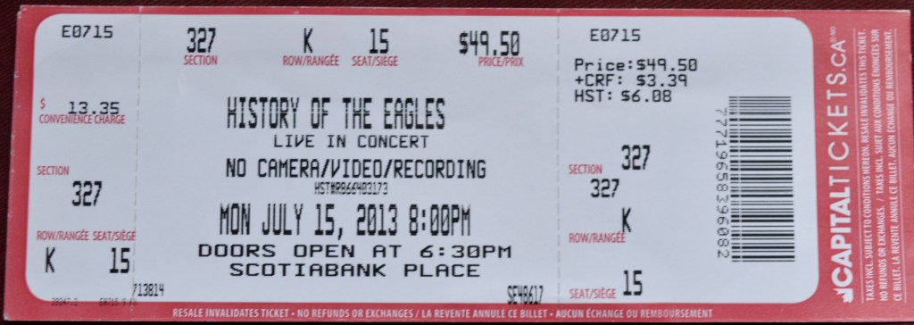 On July 15, 2013 I finally got to see The Eagles. I had balked at the ticket prices for their Hell Freezes Over tour (funny how $100 a ticket seemed outrageous at the time) and had missed the few opportunities since. I believe this ticket came as a birthday gift so this time I didn’t even have to consider the ticket price.
