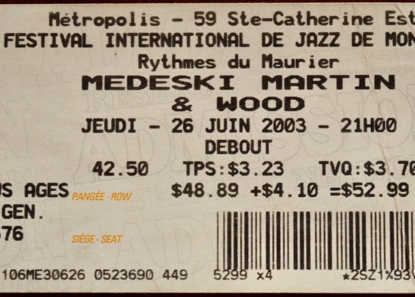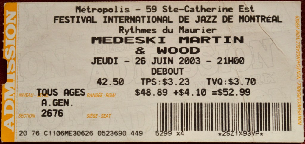 I seem to recall the Toronto jazzfest people kicking down free tickets for us…somewhere deep in my mind there’s a rattle of a memory of a bit of a mixup that had me on the guestlist but left the guys in the band off, or was it the other way around? Anyway, the same fuzzy memory reminds me that we enjoyed no such courtesy in Montréal and actually had to shell out our own hard-won cash for tickets to the MMW show at Metropolis.