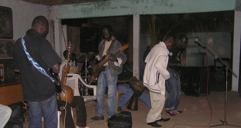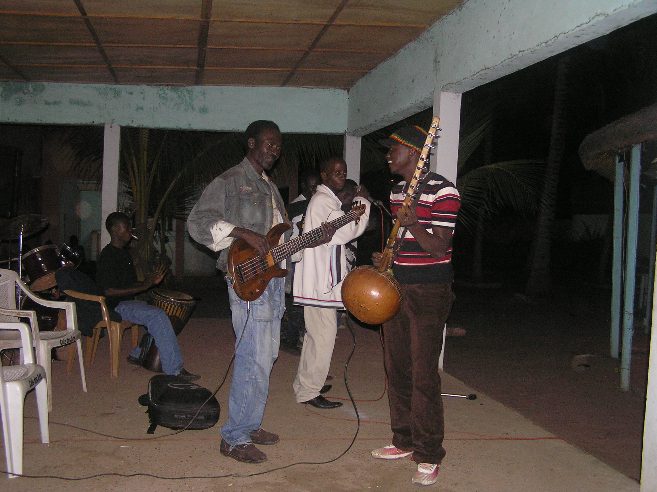 Five minutes later we were at the Palais des Arts, a fairly large building that hosts concerts and theatre productions. Around the back was an outdoor area called the Cafe des Arts* where a band called Mondank was kicking it down before an audience of perhaps thirty people. The band consisted of electric guitar, bass, djembe, drum kit, gori (like a smaller kora**), and a vocalist. They played all-original music that just seeped that wonderful, unmistakeable West African sound that pleases my soul so much. As the band weaved thousands of hypnotically repeating notes around just one or two chords the vocalist overlaid ethereal, seemingly unconnected melodies through big, overdriven speakers that lent a cackling authenticity to the overall sound.