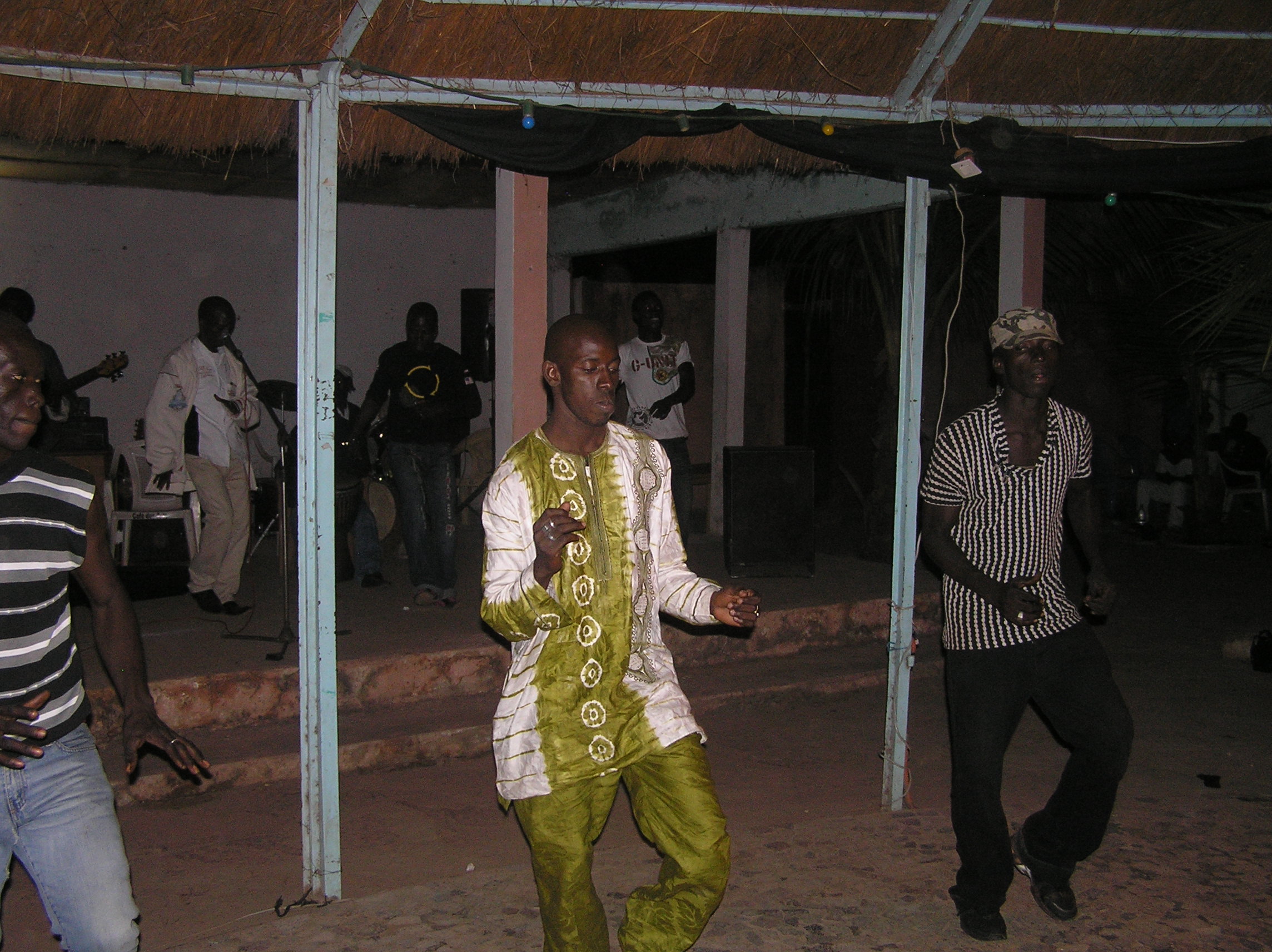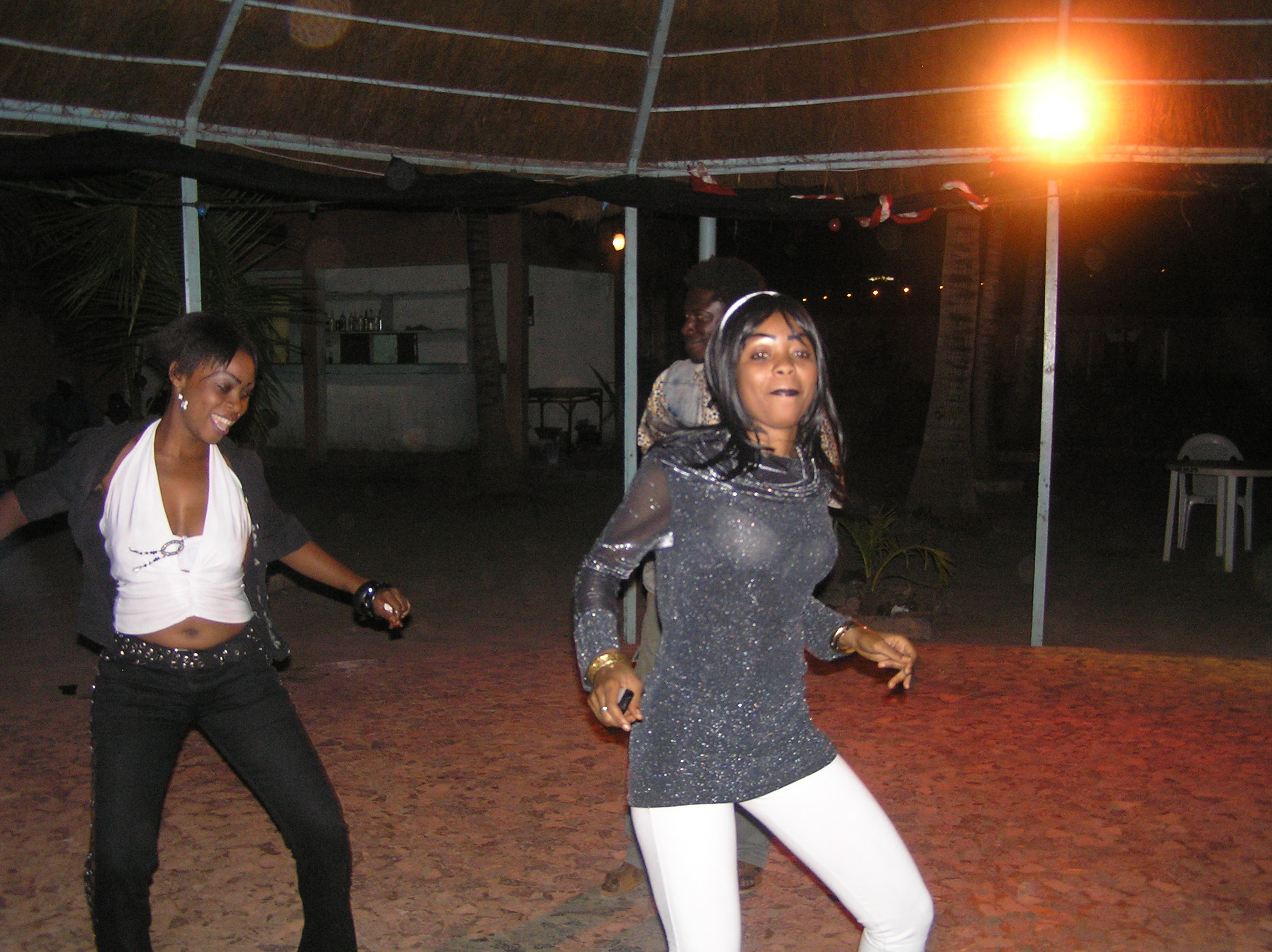 At 7:30 the band – which consisted of two djembe players and a bass drummer – arrived and started to play. The steady repeated rhythms underlying impossibly counter-rhythmic soloing was reminiscent of the beloved drumming classes I had taken at university from Malian master musician Yaya Diallo, so in addition to being wonderful and soul-affirming the music also held a bit of a nostalgic twinge for me, and I loved it. Occasionally one of the locals got up to dance, and eventually an entire group of young women arrived and took over the dancefloor. They acted like flirty schoolgirls, sticking out their butts and shaking them for all they were worth towards the stage. The musicians in turn reacted to every wiggle, drumming in time to each bounce and trying their best to literally play the girls’ asses off.