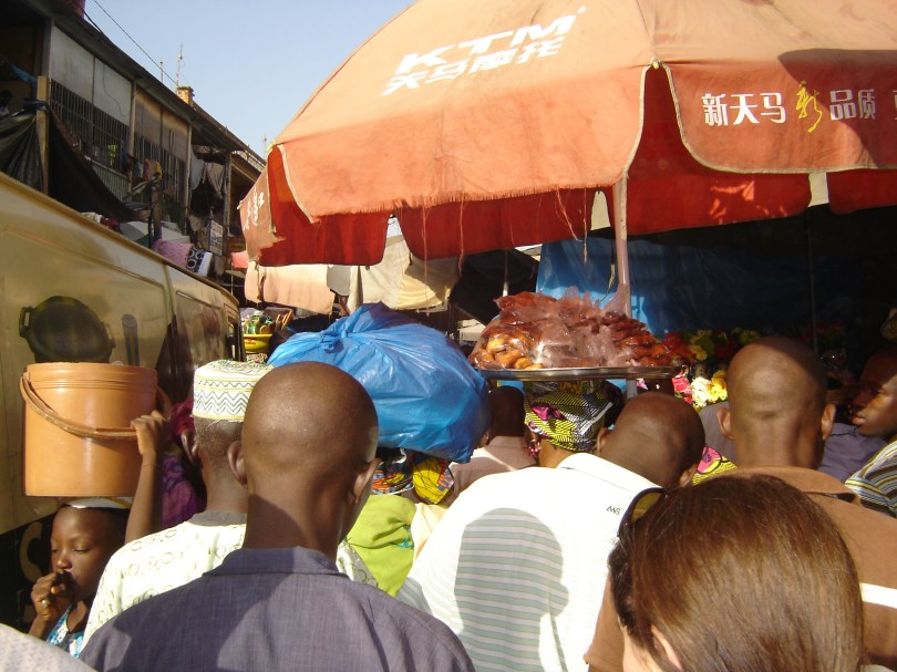 By this time m’lady and I were beyond starving, so our next stop was for lunch at a nearby restaurant. It was dark inside as we took a booth and pored over the thin, photocopied menu. We both ordered rice that came topped with a delicious onion sauce but even my manic appetite couldn’t help me empty my bowl. As the lady took away my leftovers I heard childhood echoes of my mother admonishing me to finish my dinner because there were thousands of kids in Africa who would love to have it. I washed down my guilt with a large beer and then we headed to the market.