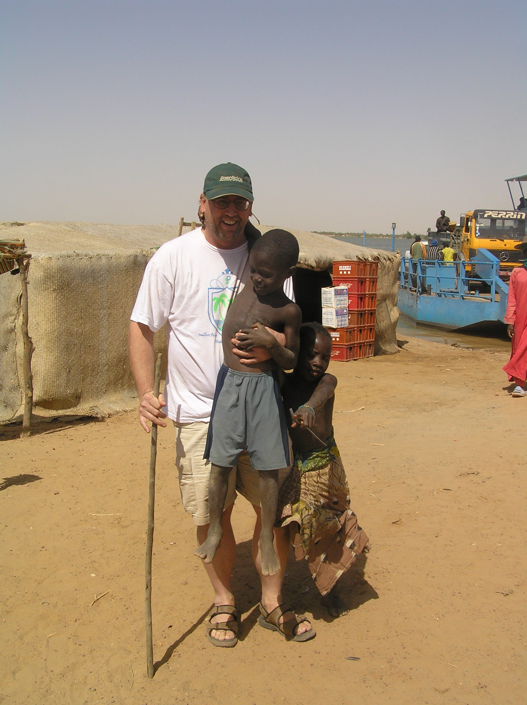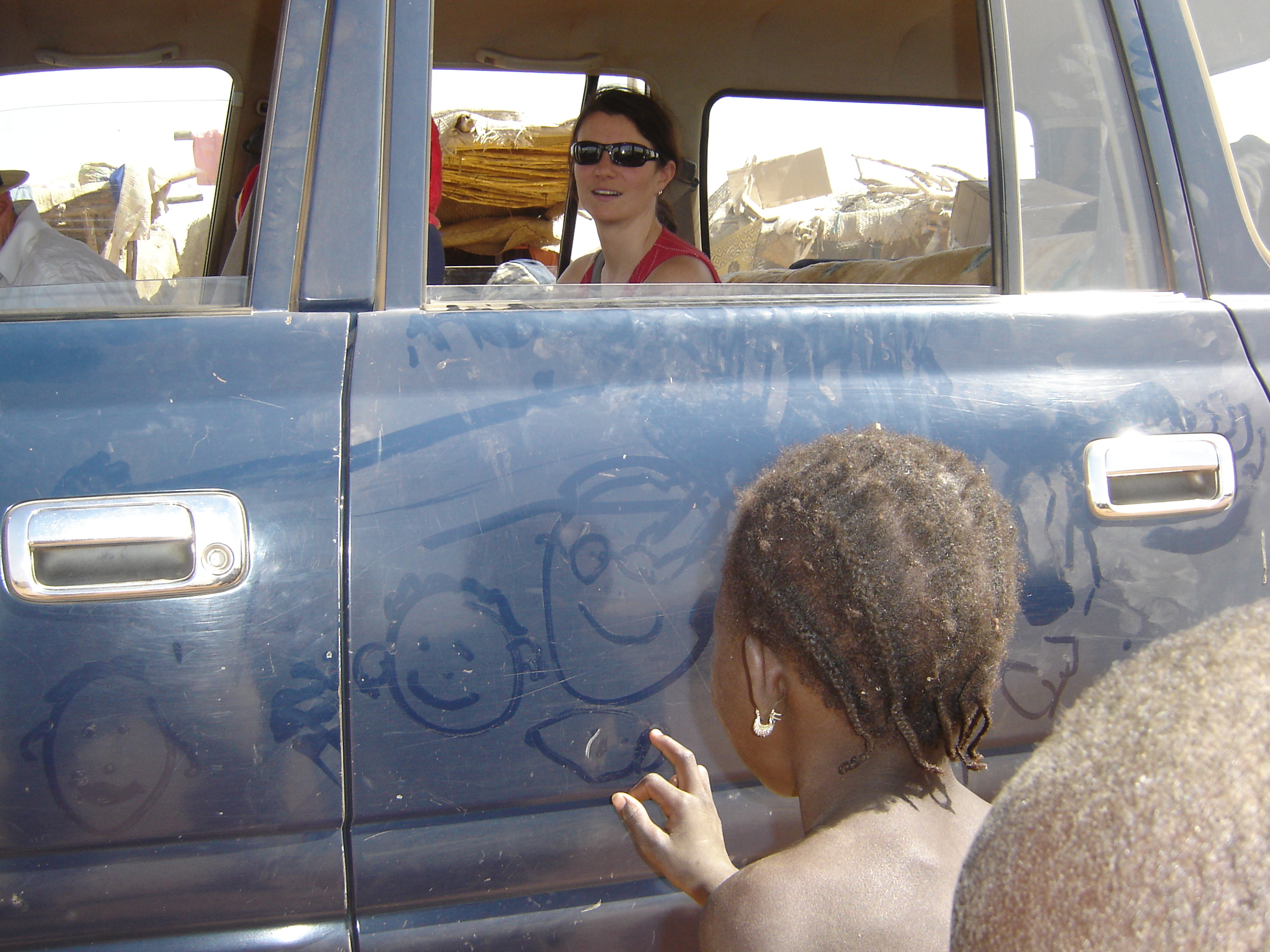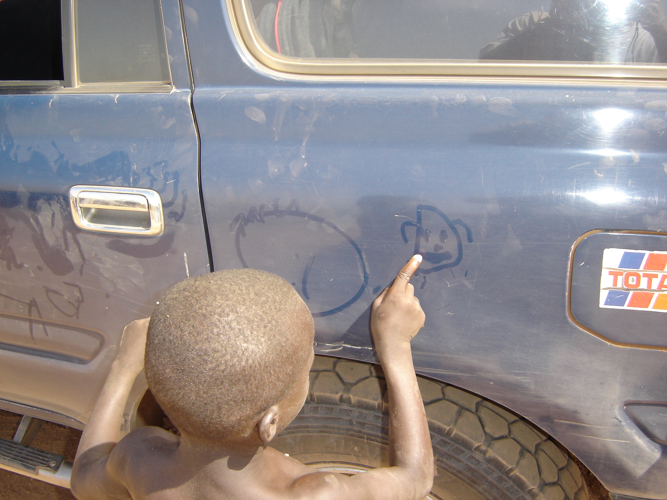 After seven hours we arrived at the shores of the Niger River. While we waited for the ferry I played with a group of children that surrounded the dock. We amused ourselves by finger-painting portraits of one another into the dust-caked body of the 4×4. Meanwhile an impromptu game of hacky-sack broke out, but of course nobody actually had a hacky-sack. The game began with some sort of unidentified fruit peel in place of a real ball before upgrading to an empty cigarette pack.