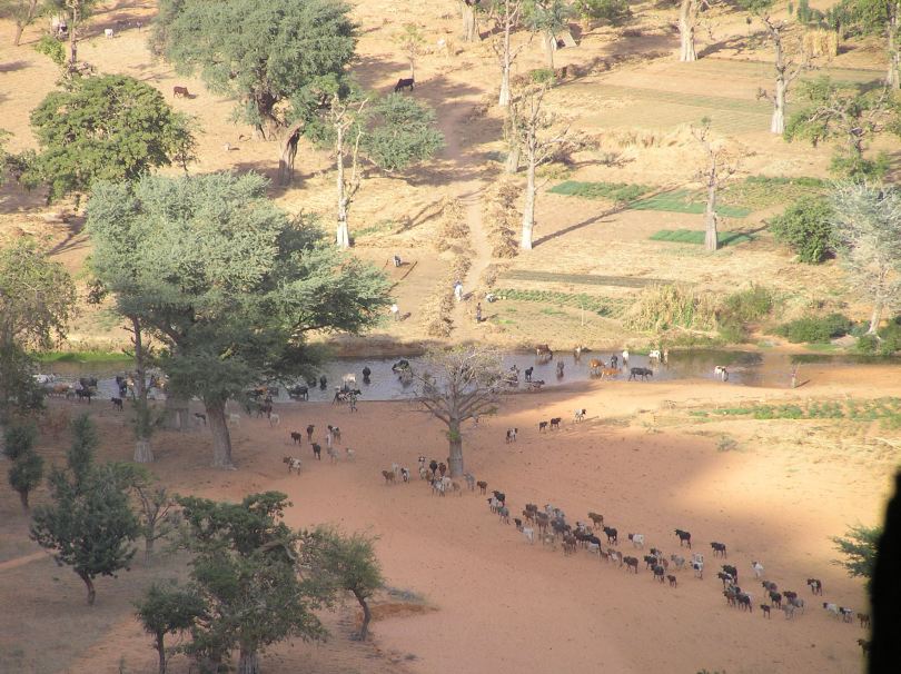 Like the bus, the road was in surprisingly good shape, and we progressed at an admiral clip. The view outside the window was reminiscent of a CARE infomercial. Scraggly trees and patches of grass grew out of the dirt dividing one mud-brick village from another. Whether driving cattle, herding goats, or sitting beside the road absent-mindedly swatting flies away from buckets of fruit for sale, everywhere I looked I saw people working hard to make their way through the sweltering day. The bus would stop periodically, each time setting off a flurry of women who clamoured towards the bus carrying baskets of food, drinks, and other things to sell to the passengers. During one such stop a man rode by on a bicycle with a live goat strapped to the back, a sight that seemed utterly unremarkable to everyone but us. I noticed one solar panel amongst the entirety of the seemingly otherwise unpowered villages, and that single panel was accompanied by a prominent sign advertising the agency that had supplied it.
