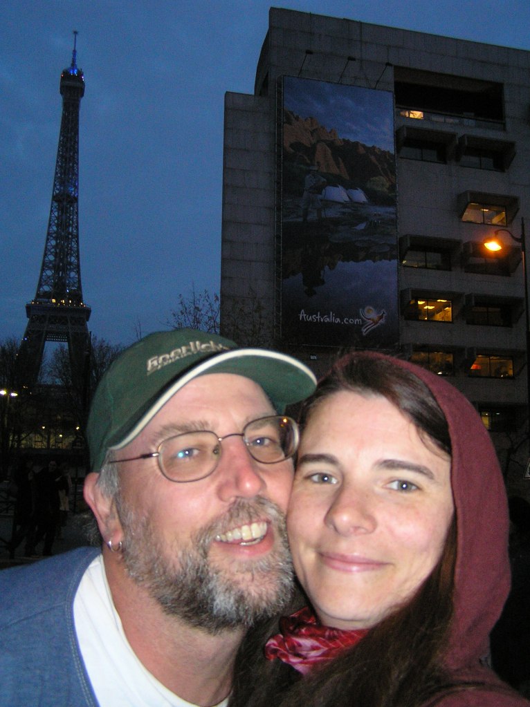 Using priceline.com we’d booked ourselves into the three-star Novotel La Defence for just $55 a night (prices posted in the room started around 200 euros), Were assigned to a corner room on the 11th floor. As soon as we stepped into the room I threw back the curtains and was shocked to see the Eiffel Tower standing in the distance, just like in the movies. I took m’lady into my arms and we danced ourselves silly at the mind-numbing luxury of our accommodations. Pillows, a comfy bed, no mozzie net, in-room toilet and shower and bath, hot and cold running water that was safe to drink, a coffee maker, fridge, desk, and couch…it was all so glorious. We spun around arm-in-arm until we fell onto the bed, landing with a comfort that tingled.