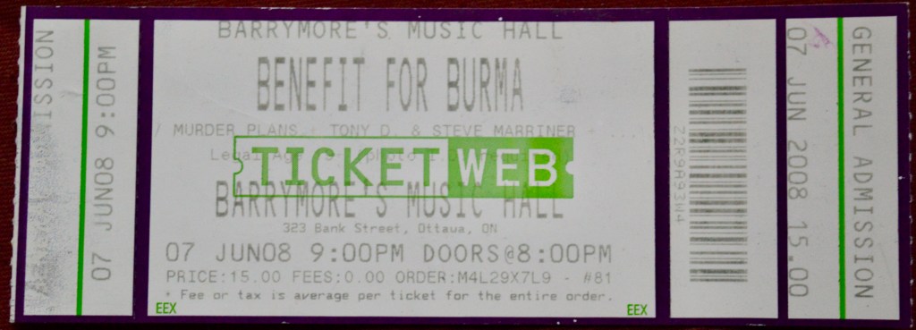 Not long before we had met each other m’lady had done some fairly extensive travelling through the area and she had nothing but great things to say about her experiences in Burma. And bless her kind soul, she took it upon herself to immediately plan a benefit concert to help the Burmese relief effort. In no time at all she had booked a great room and a great lineup, put up posters and sent out a press release, and she even collected a pile of nifty items for a silent auction. After a week of fantastic media coverage the day of the show was upon us; June 7th, 2008. We picked up the show’s headliner at the airport, checked him into the room that a local hotel had comped us for free and headed to Barrymore’s to set up.
