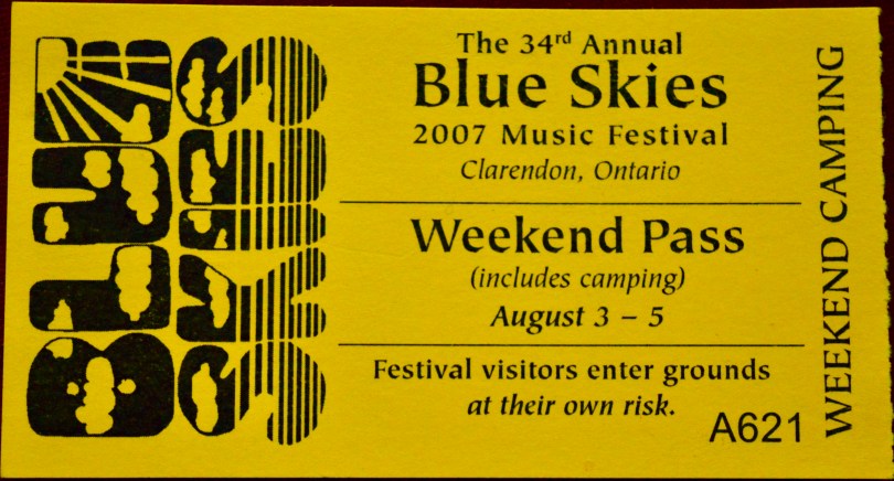 There’s a fair chance that we drove up on the Friday – which would have been August 3rd – even though my ticket book suggests otherwise. I mean, it would be almost blasphemous not to show up at Blue Skies as early as possible but I do occasionally have heathen leanings, so it’s possible we didn’t arrive until Saturday. If we skipped out on the Friday there must have been a very good reason, but who knows. Either way, we would have enjoyed a pleasant country drive that lasted for a couple of hours before winding down a dirt road just outside the magical mystery plot of rolling hills and forest nestled among the mighty Canadian Shield that is Oskar Graf’s farm.