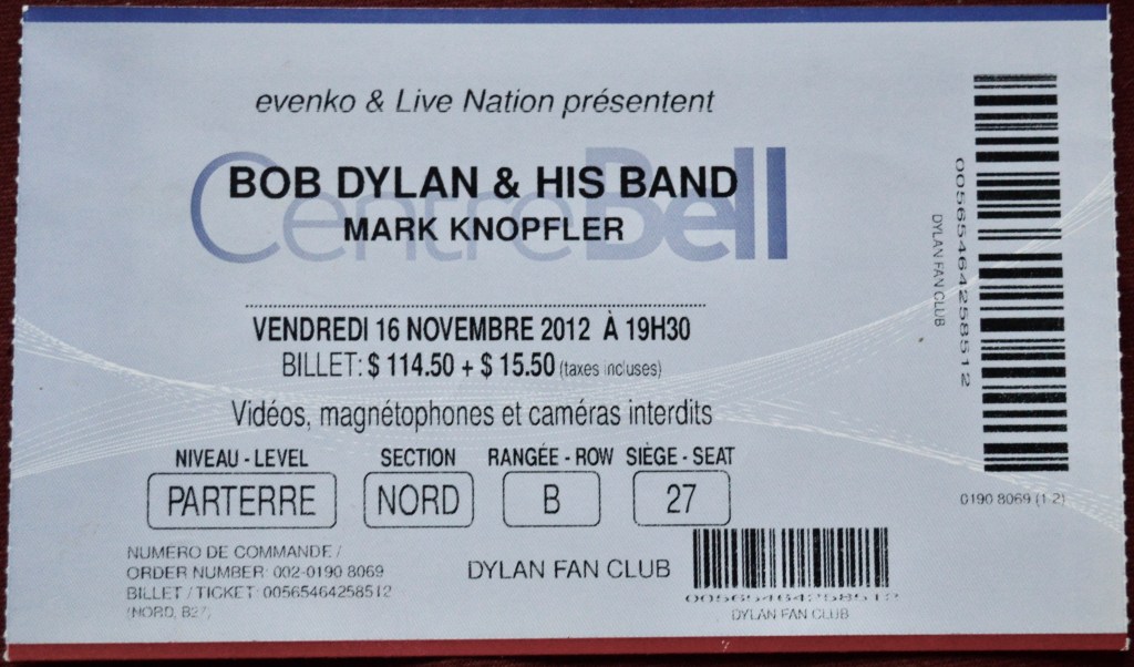 On November 16th, 2012 I drove to Montreal to see the wonderful Bob Dylan at the Bell Centre, with the amazing Mark Knopfler opening the show. Not a bad pairing huh?
