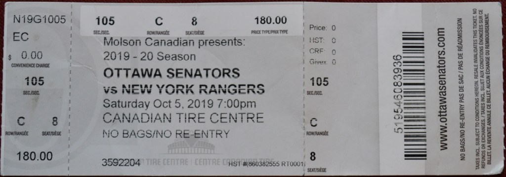 So on October 5th, 2019, following an afternoon whiskey-wake at Irene’s Pub to honour my dear late friend Bradm, I stumbled to my soon-to-be brother-in-law’s house and we drove out to the game – okay, he drove while I passenged (and slurred on endlessly about everything but hockey) – where we took in what might stand as my final live Ottawa Senators home game (it’s not like I’m dying or anything – not noticeably anyway – rather, I’ve moved away) from just across the aisle from the row behind the player’s bench. Matter of fact I was seated adjacent to the backstage tunnel so I was able to rain high-fives down onto the players’ gloves several times over the course of the evening.