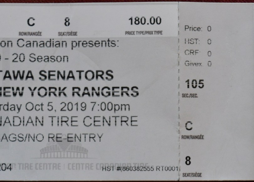 And while this was an enormous step up from the only other time Phil and I saw a game at the Canadian Tire Centre together (when I discovered that yes, I was indeed alone in appreciating the super-cheap standing-room-only section behind the upper rim of the bleachers), the game itself was lousy. The Sens were at the beginning of an embarrassingly bad season – one that was only improved when all sports worldwide were cancelled due to a planetary pandemic – and the fumbling, stumbling team was painful to watch, especially from up close.