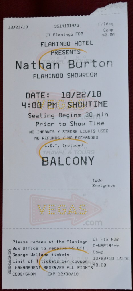 The magician on stage was a youngish man named Nathan Burton. Ring a bell? Of course not. Dude was featured on America Judges Talent or some such monstrosity and won himself his very own show on the Vegas strip. He seemed to have won himself an audience too; as far as I could tell they were giving away tickets left, right and centre just to try and get the small theatre half-full for Burton’s daily afternoon performances.