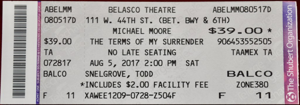 On August 5th, 2017 I went to see America’s biggest thorn-in-the-side, Michael Moore. He was doing a short run one-man show on Broadway called The Terms Of My Surrender and the balcony tickets were only $40. I was in town for a string of Phish shows at Madison Square Garden and figured a Saturday matinee with the Left’s favourite scallywag would be a nice way to break up the week’s entertainment.