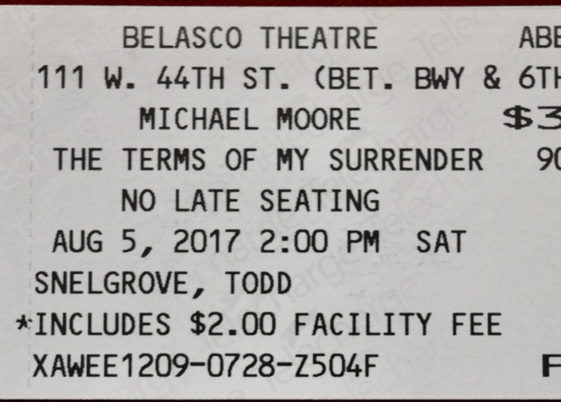 On August 5th, 2017 I went to see America’s biggest thorn-in-the-side, Michael Moore. He was doing a short run one-man show on Broadway called The Terms Of My Surrender and the balcony tickets were only $40. I was in town for a string of Phish shows at Madison Square Garden and figured a Saturday matinee with the Left’s favourite scallywag would be a nice way to break up the week’s entertainment.