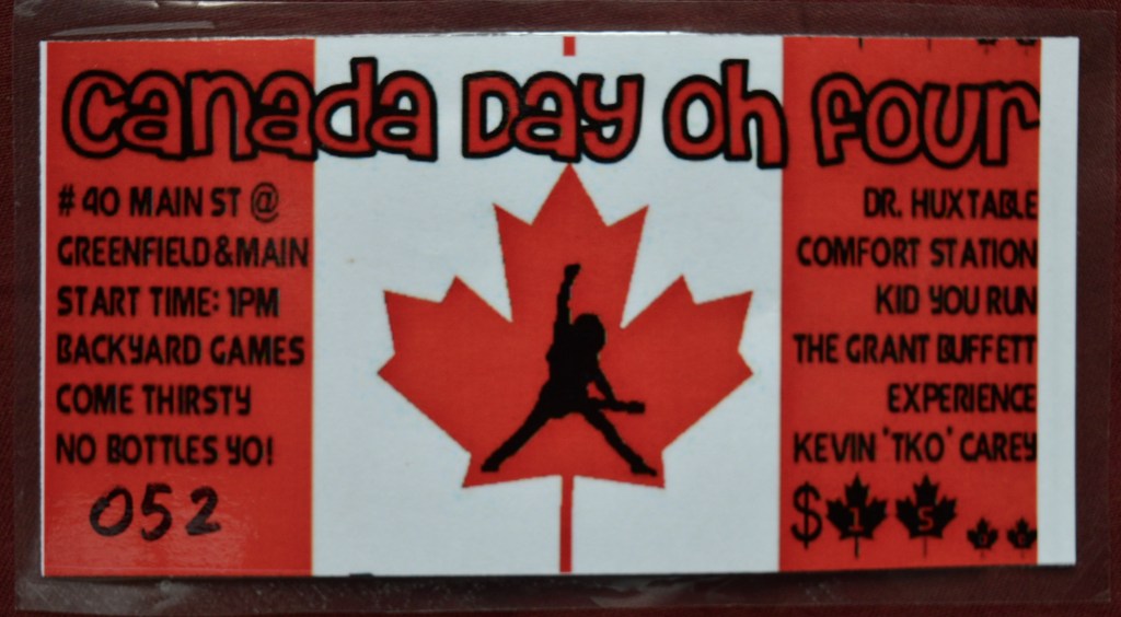 Anywho, for a spell my Canada Day evolved to include an annual all-day backyard bands & beer party at the notorious Ottawa address of 40 Main Street, an event that I was asked to MC on at least two occasions. As you can see from the ticket included above, today’s missive is ostensibly (if not verbosely) focussed on one of those parties. Unfortunately not every Ottawa Canada Day I’ve experienced came with a ticket, not even the 40 Main parties, so the bulk of my deliriously celebratory nationalistic memories shall likely remain unrecorded except in my ever-eroding mind. Aside from those that spill out here, of course. And so I spill: