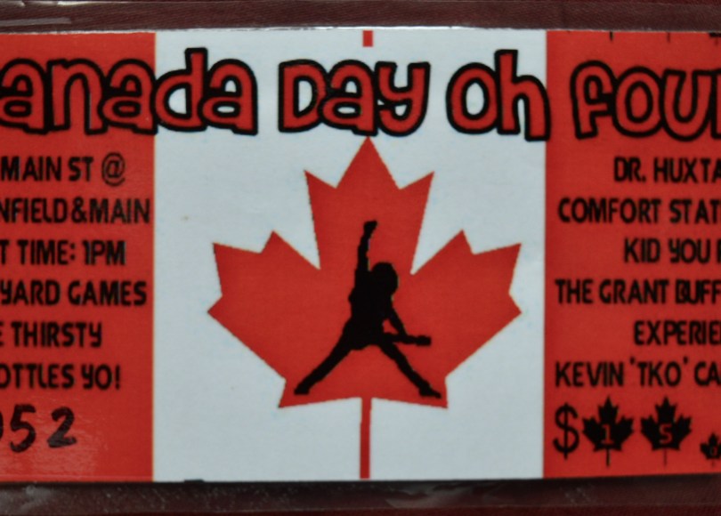 Anywho, for a spell my Canada Day evolved to include an annual all-day backyard bands & beer party at the notorious Ottawa address of 40 Main Street, an event that I was asked to MC on at least two occasions. As you can see from the ticket included above, today’s missive is ostensibly (if not verbosely) focussed on one of those parties. Unfortunately not every Ottawa Canada Day I’ve experienced came with a ticket, not even the 40 Main parties, so the bulk of my deliriously celebratory nationalistic memories shall likely remain unrecorded except in my ever-eroding mind. Aside from those that spill out here, of course. And so I spill: