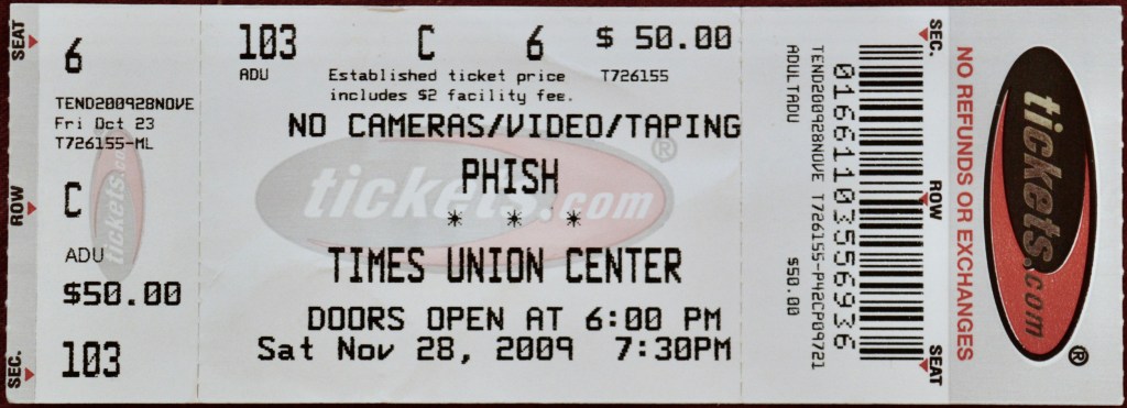 On November 28th, 2009 I attended the second of a Phish two-nighter in Albany, New York, something I was really starting to get in the serious habit of doing. Actually, checking my stats (yes, there are Phish stats*, and yes, being a Phish fan is much akin to being a sports fan), I see that this was Phish concert #37 for me, and if that shocks you then I think you’d better sit down.
