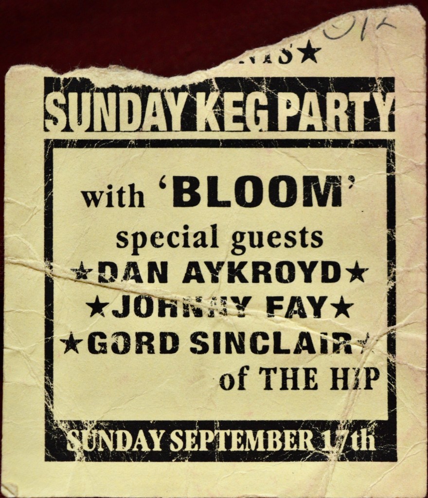 I pulled into my friends parent’s driveway and was welcomed with open arms. My buddy let me in on the secret: Dan Aykroyd had just opened up a bar in Kingston called the Ghetto House Cafe (this was before his association with the House Of Blues franchise) and as a promotion he was going to perform that night with a great local act called Bloom and members of The Tragically Hip.