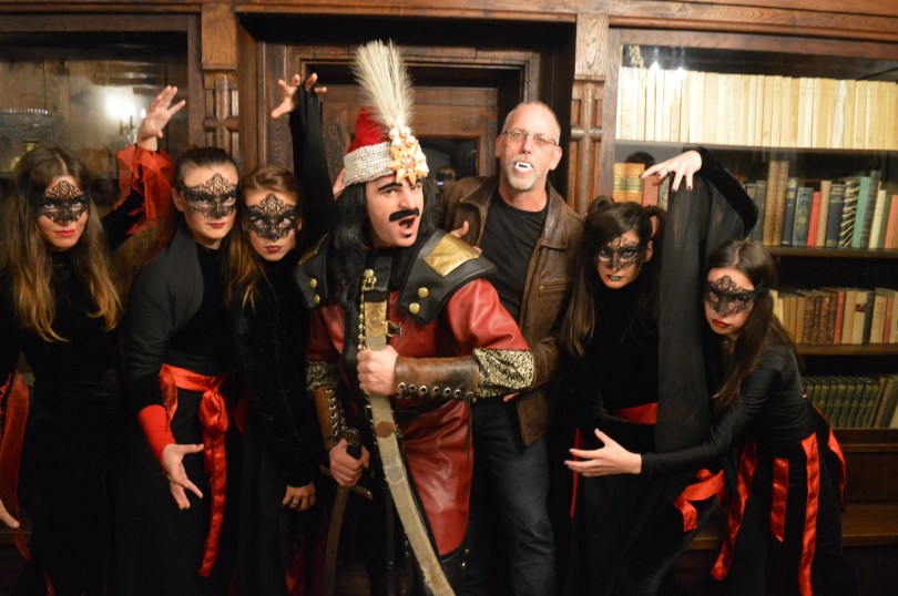 The sight of the monolithic structure looming from atop the hill was suitably impressive – just google a picture of it – especially lit up as it was in morphing swaths of colourful spotlights, a special feature created for just this evening. At the base of the castle was a lane sided with shops selling any manner of Vlad/Dracula kitsch and not just a little mulled wine, which served as a hearty treat on a nippy autumn evening. Up the middle of this lane was an astoundingly long lineup to get in to the castle for the party, so long in fact that my mother and I walked the length of it to make sure we wouldn’t be waiting unnecessarily, as we had pre-purchased tickets.