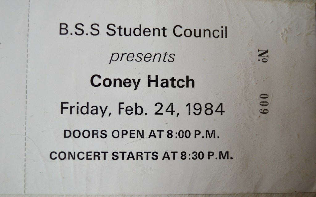 Then I heard about this Coney Hatch concert happening in the gym at Bayview Secondary. Cool! Teenage Head had played when I was a student but I didn’t really know the band so I didn’t go. I regretted it the moment I saw a classmate wearing one of the band’s tourshirts the next day***. But I was amazed that Coney Hatch – a band with a song on the radio (Monkey Bars) – would be playing at my old school so I dropped most of my worldy fortunes on a ticket.