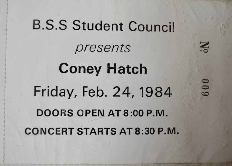 Then I heard about this Coney Hatch concert happening in the gym at Bayview Secondary. Cool! Teenage Head had played when I was a student but I didn’t really know the band so I didn’t go. I regretted it the moment I saw a classmate wearing one of the band’s tourshirts the next day***. But I was amazed that Coney Hatch – a band with a song on the radio (Monkey Bars) – would be playing at my old school so I dropped most of my worldy fortunes on a ticket.