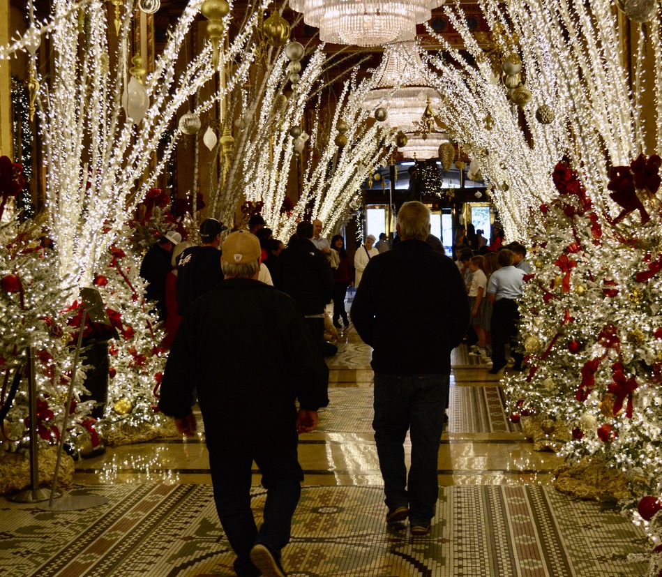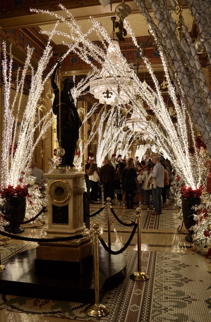 Stepping through the door one’s senses are immediately pummelled with everything Christmas. There can be no doubt that the Roosevelt does indeed boast the largest annual presentation of holiday lights in all of New Orleans. I can’t tell you how many Christmas trees they had lining the long, ornate hallway…Dozens? Hundreds? Standing between the trees and otherwise scattered throughout the lobby were huge poinsettia-filled pots with long, ribboned birch branches sticking out of them, and absolutely everything in the room was covered with tiny white lights. There were lights everywhere.