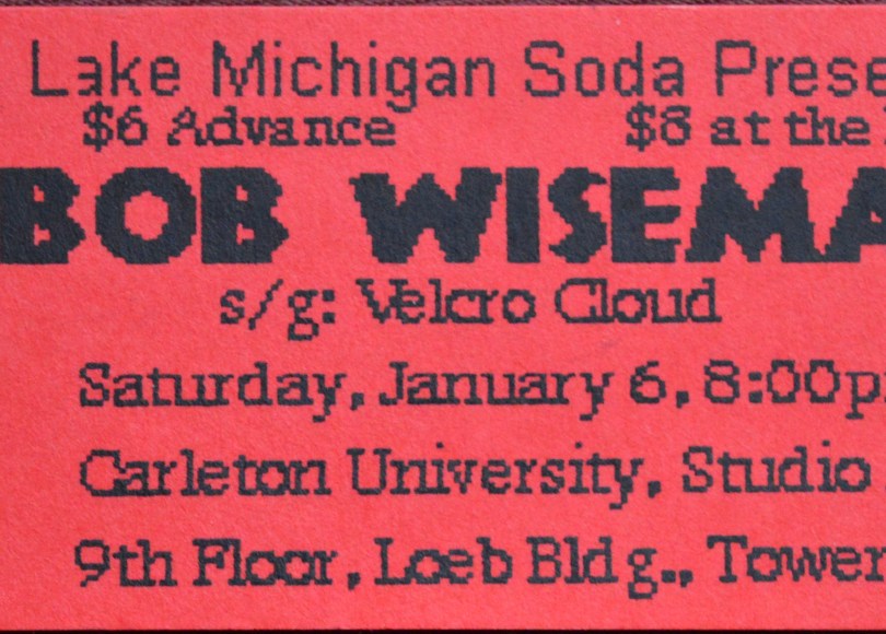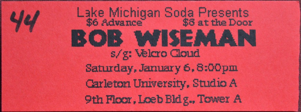 Well I suppose that’s not really true, I had a hand in promoting lots of shows featuring bands I was actually in over the years, but this was the first time I was acting strictly as a concert promoter. To ease the pressure the first thing I did was hire myself to open the show. That was easy. Then I set a date when Bob Wiseman and the room were both available, printed tickets and posters using only the most cutting-edge computer graphics available at the time, and sat around until the day of the show worrying that I was going to lose my shirt (okay, $200) – which is every concert promoters biggest job (worrying, that is).