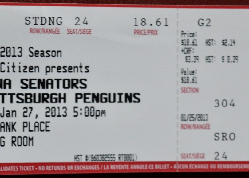 And so it was on January 27th, 2013 that I was treated to a shootout between the Sens and the Pens after three periods ended with a 1-1 tie. It is written in my concert book that the Senators lost the shootout, but I didn’t write any other details. No doubt Sidney Crosby shot for Pittsburgh and for lack of clearer memories I’ll just imagine that he scored and won the game.