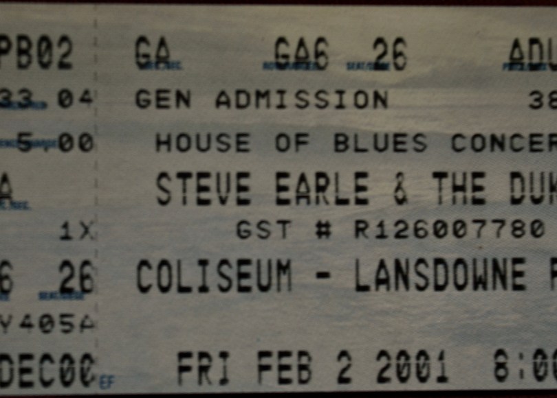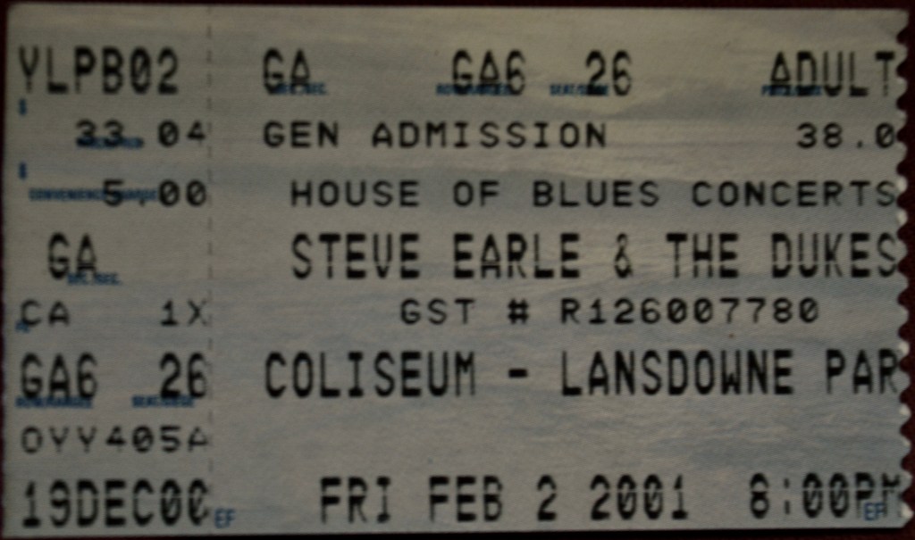 Aside from his monstrous hit of ’88 Copperhead Road I had lived a life almost wholly ignorant of Steve Earle until I saw him perform in a song-circle sort of concert at the National Arts Centre alongside John Prine, Bruce Cockburn, Emmylou Harris and a few others. That was a great show so when Steve rolled through town a couple of months later on February 2nd, 2001 I decided to check it out.