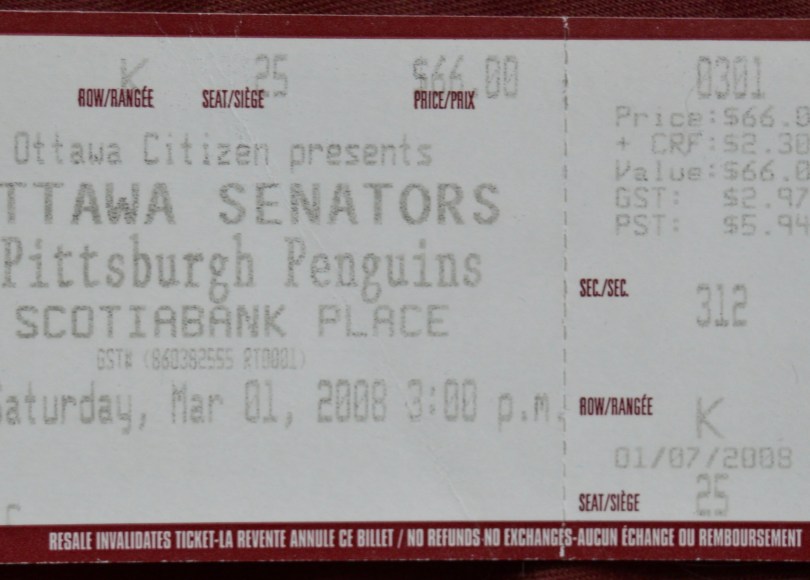 I also learned that dropping $150 on a pair of half-decent tickets to the Sens/Pens game on March 1st, 2008 was essentially a waste of money. As we sat down in our seats the first question out of his mouth was, “How many periods are there?”