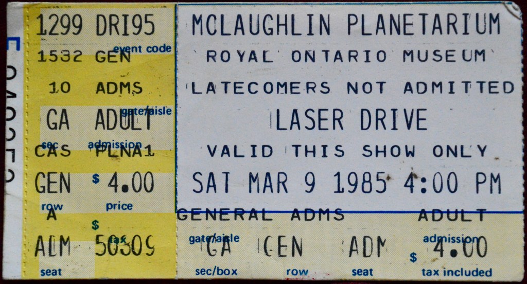 On March 9th, 1985 I went to my first laser show, Laser Drive at the McLaughlin Planetarium in Toronto’s Royal Ontario Museum. My girlfriend and I had up and decided to leave New Brunswick and throw our hats into the ring in Toronto. We barely had a nickel to rub together and at first we were each living in our own gender-mandated hostels north of the city. I eventually got a job as a janitor in a car-rim factory in Newmarket and we rented a room together.