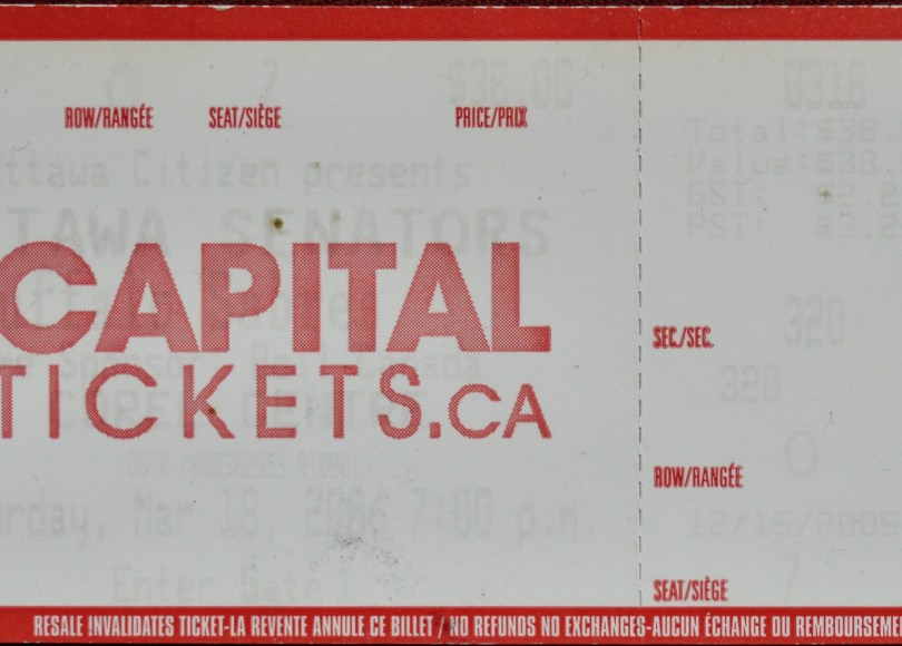 And then there is what we have here.  This little Shroud of Turin was actually a ticket to watch the Ottawa Senators play the Buffalo Sabres at the Palladium on March 18th, 2006, but you wouldn’t know it.  Somebody along the way decided to save a buck or two on their ink-cartridge contract and I’m left with this near-blank ticket stub in my collection.