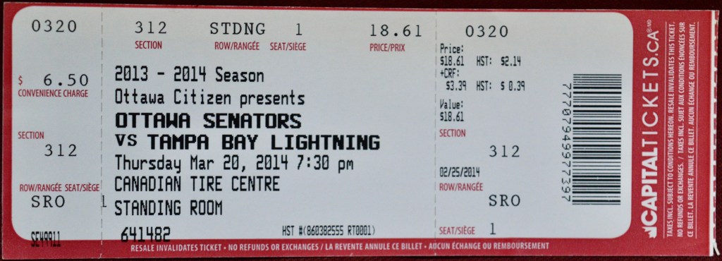 During the whole of the 2013-14 season I only went to see the Ottawa Senators twice, and strangely enough the two were back-to-back home games. For the first (March 18th against the Rangers) I had been fortunate enough to receive a last-minute phone call and attended with (and courtesy of) my good friend Huss. For this game (March 20th against Tampa Bay), I made a feeble attempt to pass it forward and invited m’lady’s brother-in-law (m’brother-in-law I suppose) to join me.