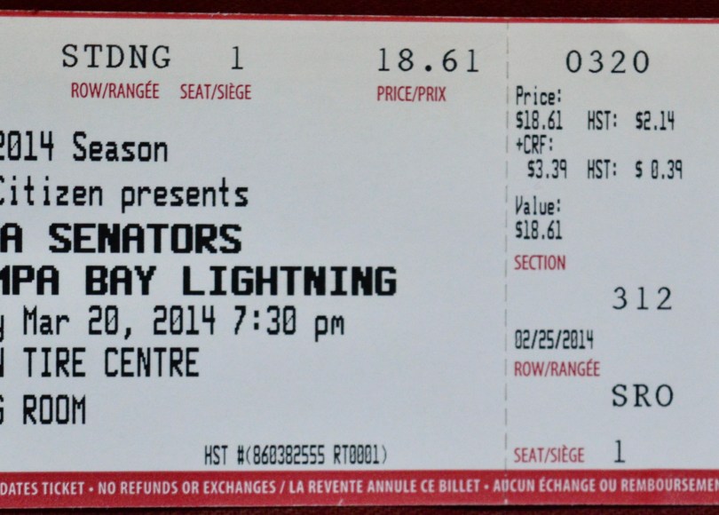 During the whole of the 2013-14 season I only went to see the Ottawa Senators twice, and strangely enough the two were back-to-back home games. For the first (March 18th against the Rangers) I had been fortunate enough to receive a last-minute phone call and attended with (and courtesy of) my good friend Huss. For this game (March 20th against Tampa Bay), I made a feeble attempt to pass it forward and invited m’lady’s brother-in-law (m’brother-in-law I suppose) to join me.