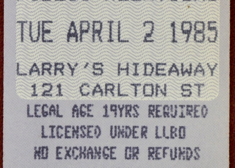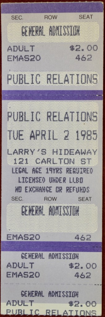 *Oh my. I just did the math and realized that this ticket would have been from when I was seventeen years old, not fifteen. Geez. So, I’m sure this wouldn’t have been from their first gig in Toronto and it wasn’t from the era that I’m writing about at all, back when we would all hang out at whoever’s aunt’s house. This ticket stub would have actually been from two or three years later than that. In the time between us hanging out at the aunt’s house and this ticket I would have ran away from home by hitch-hiking from Richmond Hill to Moncton (aged fourteen), came back to Ontario and purposely flunked out of school for two years, moved with the family back to Moncton and continued flunking out until I turned sixteen, when I dropped out and hitchhiked back to Richmond Hill (in the dead of winter and almost froze to death. I’ll tell you about it sometime…), where I got a job in a factory and rented a room and lived on the edge of starvation before returning to Moncton and taking up with a girl in Fredericton, where I lived for six months or so in homeless shelters and ghetto room rentals before convincing this girl to drop out of university and come with me to Ontario, where we were so poor we lived in separate homeless shelters until we finally moved in together. Or rather out, as we were homeless and lived in a park with a cardboard box of stuff and a pet cat. And that was around the time of this show which, as I believe I mentioned off the top, I did not attend.