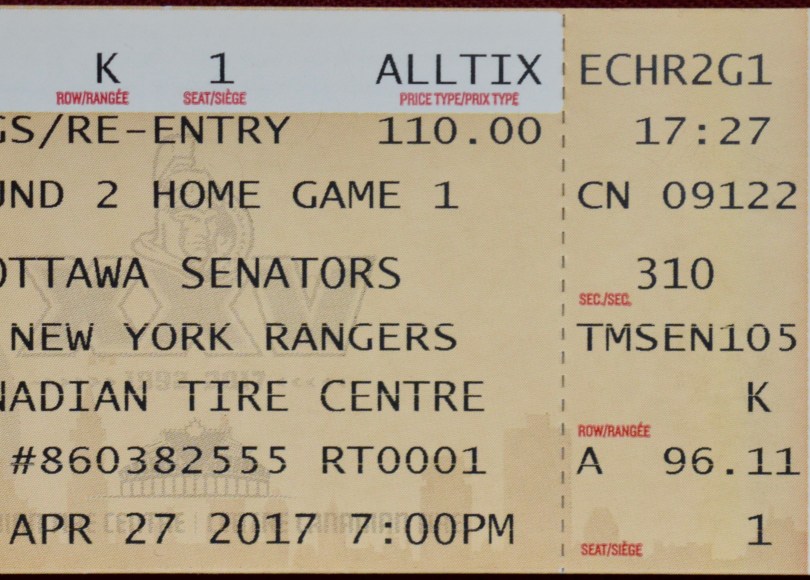 On April 27th, 2017 I went to see the Sens take on the Rangers. It was game one of the second round of the playoffs and though it’s not like me to buy tickets to the first game of a series, I did – likely on account of the stupid Rangers being m’lady’s most hated team in the league (a throwback to them beating out her beloved Canucks in the finals way back when).