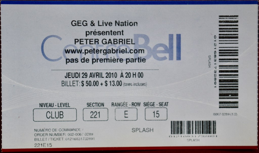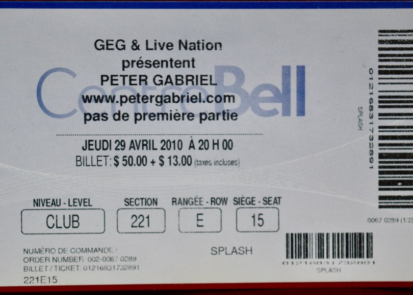 On April 29th, 2010 I went to Montreal to see Peter Gabriel. He was touring in support of his new, rather unique album Scratch My Back, an interpretation of cover songs set to orchestral music. I’ve long been a fan of Peter Gabriel’s solo career and the few times I had seen him live before this (twice?) were nothing short of astounding, so I was excited to have a ticket.
