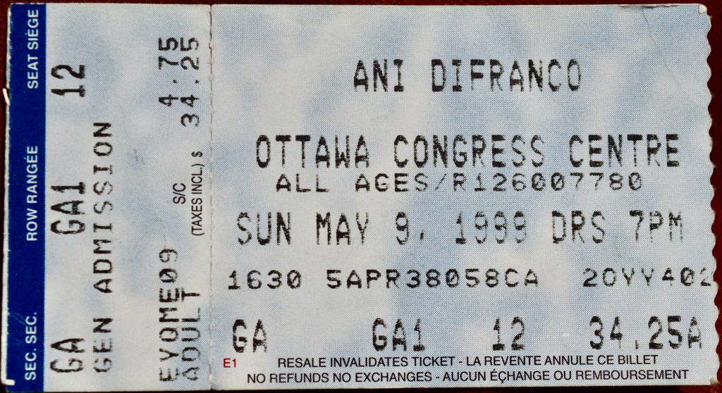 This would be the only time I’d see Ani DiFranco (so far) though I went on to see Drums & Tuba many times. It was one of those shows where I got more out of the (previously anonymous to me) opening act than the headliner. It wasn’t the first time and wouldn’t be the last.