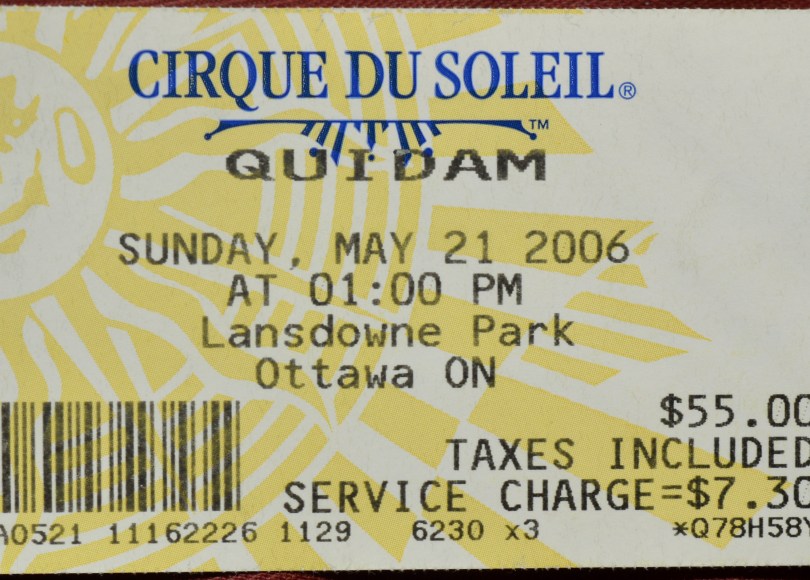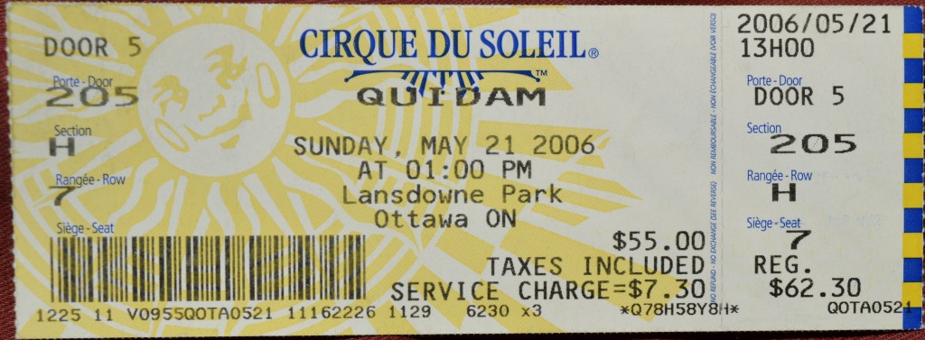 On May 21st, 2006 I walked a few hundred metres from my apartment on Adelaide Street to the old, pre-renovation Lansdowne Park where the Cirque crew had their Ikea-coloured big-top Grand Chapiteau set up beside our own, ornate Cattle Castle. I’ve never seen an ‘arena’ Cirque show and I suspect I would be a bit disappointed not being in one of their specially-made circus tents*. They’re small, they’re fun and they’re cool – the raked house surrounds a circular stage above which any manner of mysterious hardware dangles from the multi-pointed canvas ceiling.
