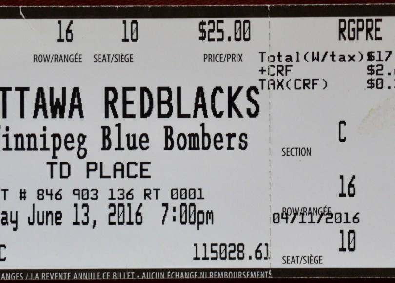 On June 13th, 2016 I cycled down the canal to Lansdowne Park (was it still called that?) to see the Ottawa Redblacks put on a CFL performance with the Winnipeg Blue Bombers.
