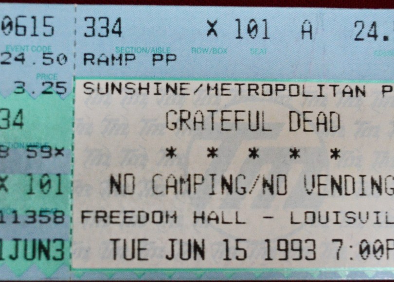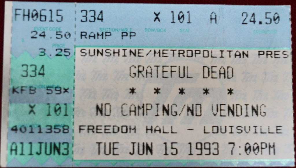 I remember we hit Cincinnati during their mini-Grand Prix – which I think involved go-karts – where Jojo and I cleaned up making balloon animals for the busy sidewalk crowd, earning us more than enough money to pay for a few night’s camping fees in state parks and enough gas to get us to the next Dead show in Louisville, Kentucky on June 15th, 1993.