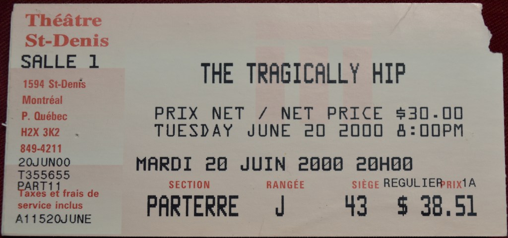 On June 20th, 2000 I drove to Montreal for my 11th concert featuring The Tragically Hip. This was at the tail end of that era where The Hip could sell out any arena in the country in minutes and I was thrilled to get tickets to see them in the relatively small St. Denis Theatre.
