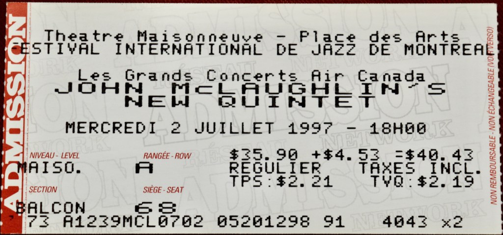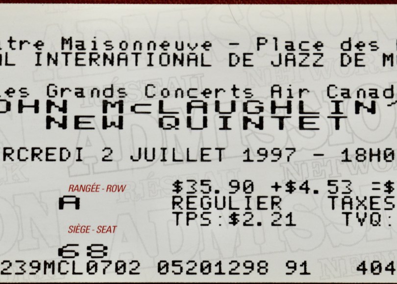 On July 2nd, 1997 I drove from Ottawa to Montreal for the fourth time in two-and-a-half weeks. Of course they had all been concerts: a James Brown show that was part of a giant free outdoor festival called Rock Scene or some such thing, a G3 guitar wank-fest featuring Steve Vai, Robert Fripp and more shredding everyone’s favourite five notes, and what would become the first of many, many Herbie Hancock performances. This trip was the last in my self-designed Montreal concert series but it was a double-shot, John McLaughlin at the Theatre Maisonneuve followed by Ben Harper at Metropolis.